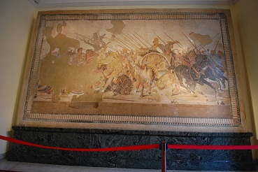 נסייר במוזיאון ונתעכב על מספר יצירות מעניינות. אחת היצירות המרשימות נמצאת באולם הפסיפסים "פסיפס אלכסנדר מוקדון" משנת 200 לפנה"ס המתאר את הקרב בין אלכסנדר מוקדון למלך הפרסי דרוויש , שעל פי חוקרי האמנות זהו קרב "איסוס" שנערך בין אלכסנדר לדרוויש השלישי. גודל הפסיפס כ 6 מ' על 3 מ' ובו משובצות מאות אבני פסיפס צבעוניות שהונחו על ידי אמנים יוונים שאינם ידועים. ניתן לזהות בברור את פניהם של אלכסנדר ודרוויש . אלכסנדר מתואר בפרופיל גלוי ראש ללא קסדה לובש את השריון כשעליו מוטבע ראשה של המדוזה רוכב או ניצב ליד סוסו( ?)מפנה ראשו לכיוון המלך הפרסי דרוייש ניצב מולו על המרכבה הסיס מגביר את המהירות וכך נראה הסוס על אחוריו, פניו של המלך הפרסי מופנות לאחור בהבעת פחד, תחושה של דרמתיות קיימת בפסיפס ונוצרת בגלל הקומפוזיציה. התמונה צפופה מאוד בחלקה התחתון בעוד שהפאנל העליון שכמעט ריק מציג אל על את החניתות והרומחים של החיילים, הפסיפס של אלכסנדר מזכיר את תבליט אחר הנמצא בשער טיטוס ברומא, כאשר בחלקו העליון ניצבים בצד אחד כל הכידונים ובתבליט השני כלי בית המקדש להדגשתם על רקע נקי מעיטורים. הפסיפס של אלכסנדר התגלה בבית "הפן" בפומפי ומאפשר לנו להבין את המצב הכלכלי של אותה משפחה שטרחה להציג יצירה כזו בביתה. הפסיפס הועבר למוזיאון בנפולי.