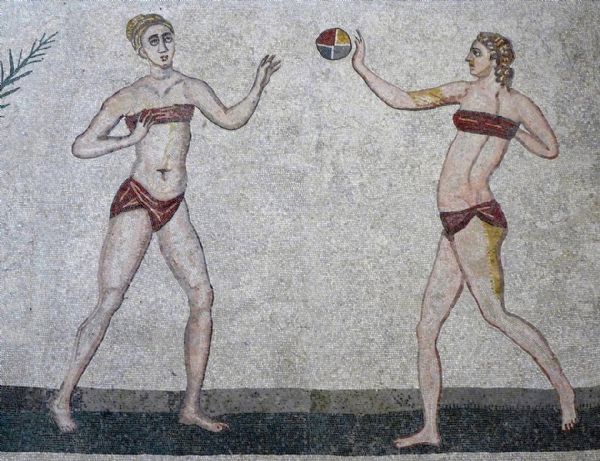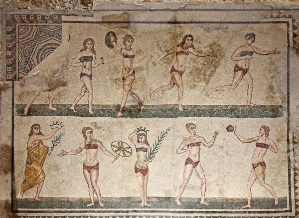בפסיפס מהווילה הרומית ליד פיאצה ארמרינה בסיציליה מוצגות נשים לבושות בלבוש מינימלי, מעין "ביקיני", בעיצוב שלא היה מבייש מעצבי אופנה בני זמננו. לבוש זה נועד למעשה לאימון אתלטי, ולא בכדי לשמש כבגד ים.